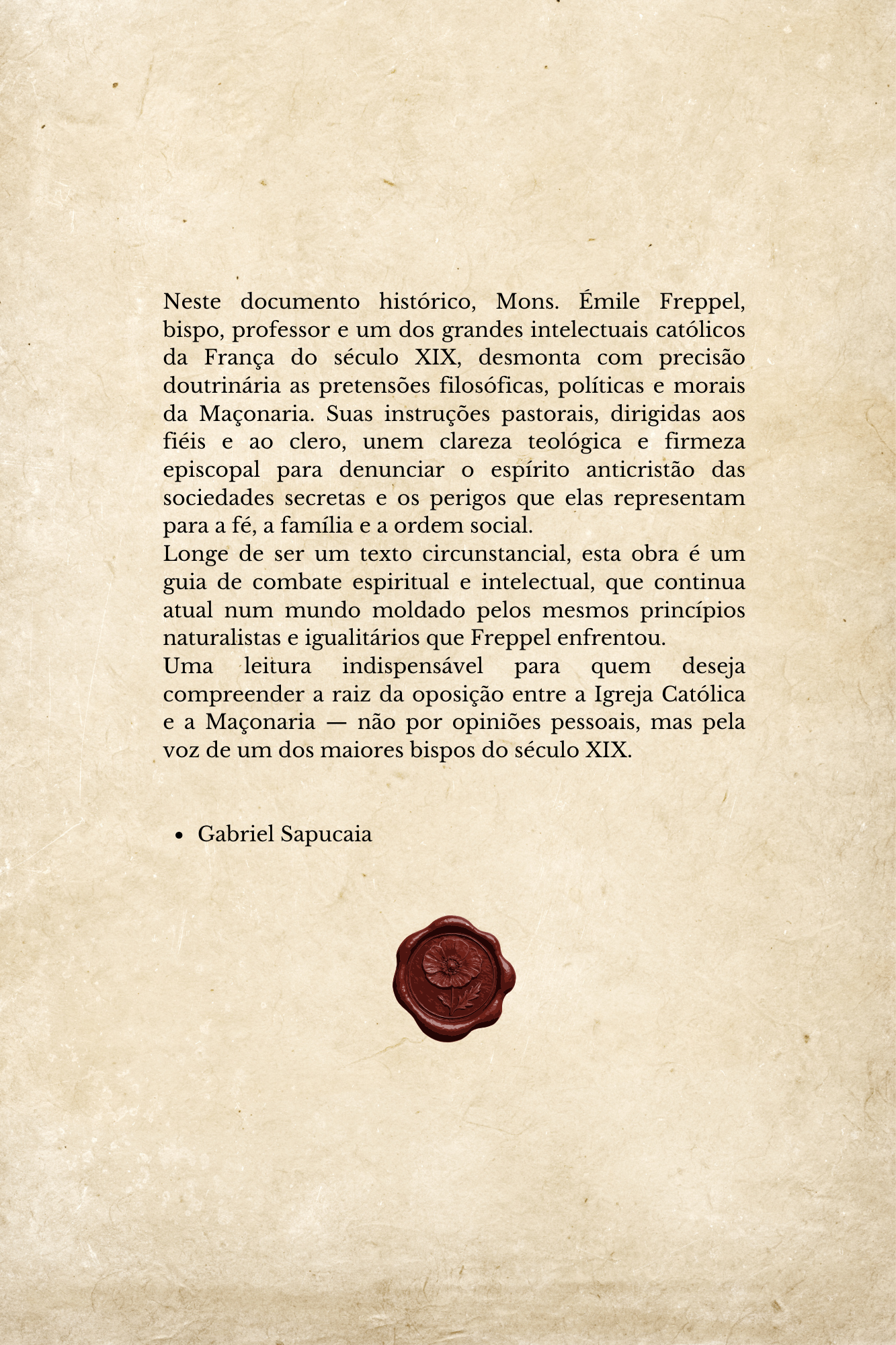 Neste documento histórico, Mons. Émile Freppel, bispo, professor e um dos grandes intelectuais católicos da França do século XIX, desmonta com precisão doutrinária as pretensões filosóficas, políticas e morais da Maçonaria. Suas instruções pastorais, dirigidas aos fiéis e ao clero, unem clareza teológica e firmeza episcopal para denunciar o espírito anticristão das sociedades secretas e os perigos que elas representam para a fé, a família e a ordem social.
