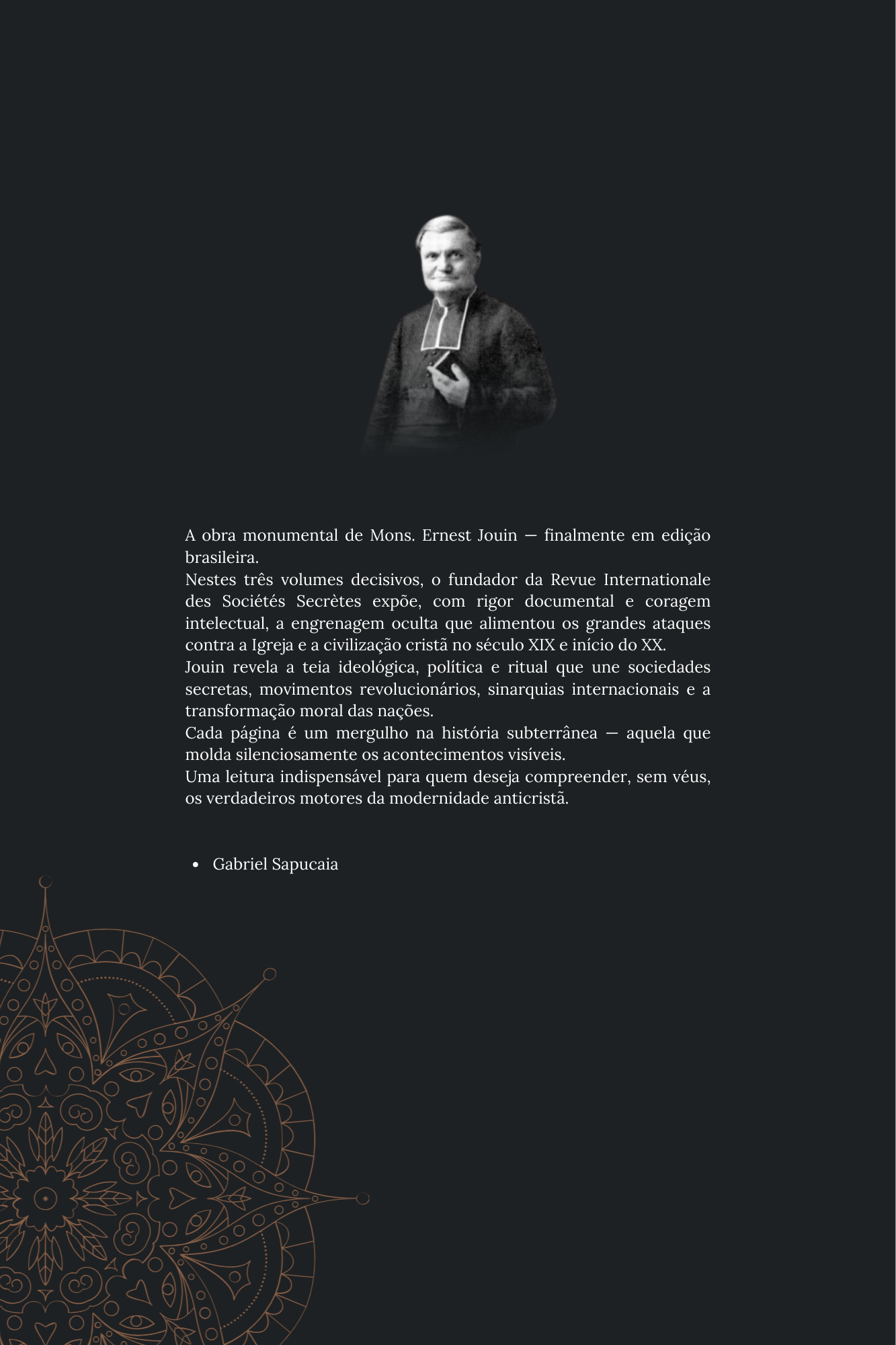 Neste volume, o fundador da Revue Internationale des Sociétés Secrètes expõe, com rigor documental e coragem intelectual, a engrenagem oculta que alimentou os grandes ataques contra a Igreja e a civilização cristã no século XIX e início do XX.